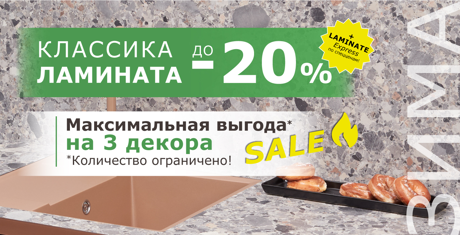 Скидка до 20%, в зависимости от декора, на заказы любых изделий с покрытием ламинат.