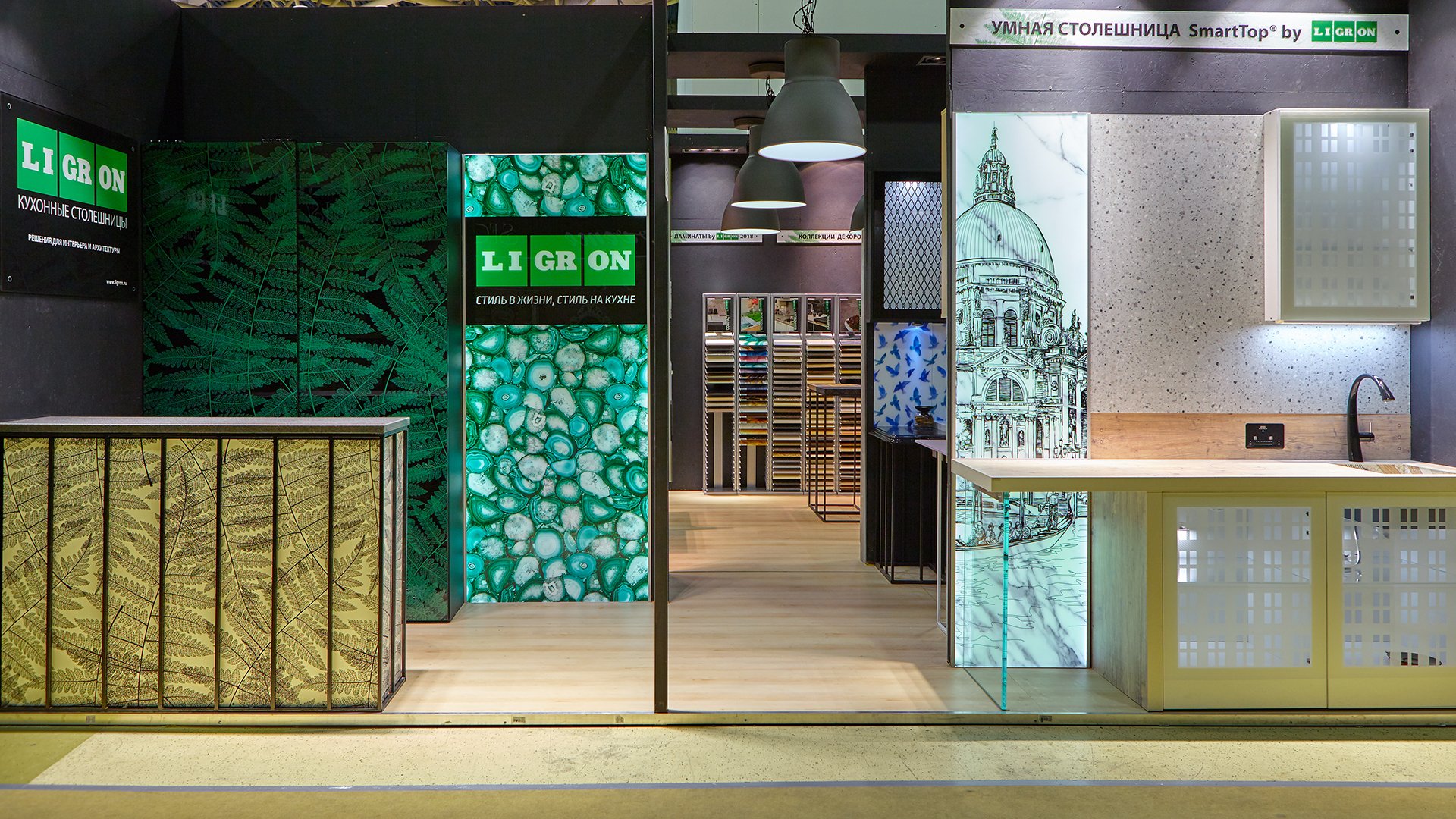 Выставка «Мебель» - главное отраслевое событие года в России. Ежегодно оно объединяет на своей площадке ведущих мебельных производителей, дизайнеров, экспертов и других представителей индустрии. В этом году крупнейший производитель столешниц и стеновых панелей по индивидуальным размерам Ligron представил на выставке 7 экспозиций с главными новинками этого сезона.