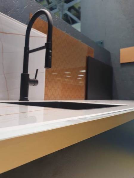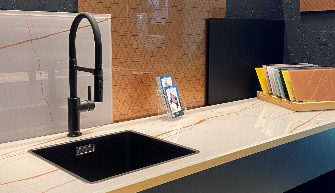 - Столешница из закалённого осветлённого стекла серии Vitrodesign® Gold by LIGRON.