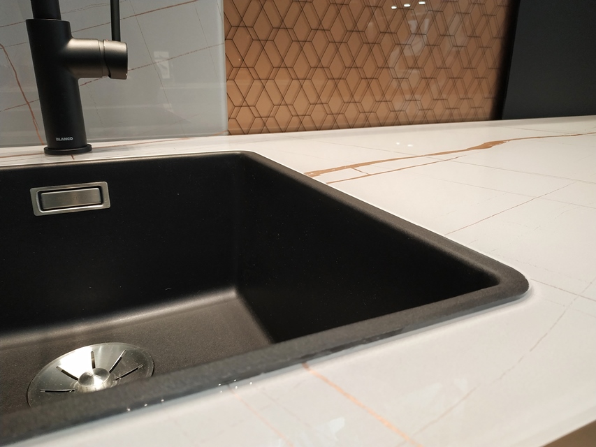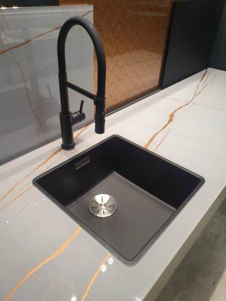 - Мойка BLANCO модель SUBLINE 400-F, артикул 525988. Врезана в один уровень со столешницей.