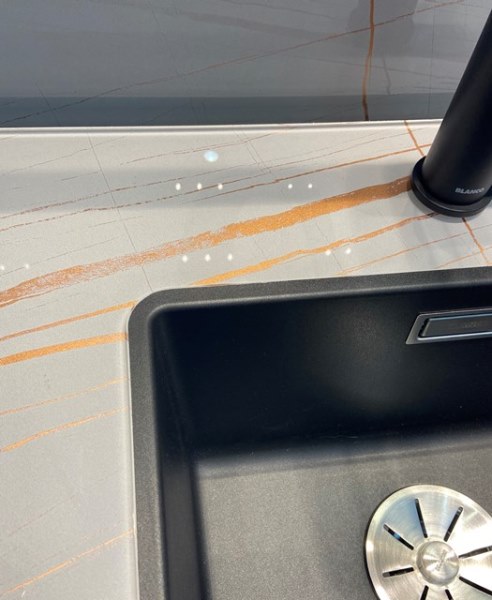 - Серия Vitrodesign® Gold. Декор 1642 Сахара нуар + фон 2234 Эфес серый (соответствует материалу Fenix NTM арт. 0725) + 1526 Коппер люкс (цвет прожилок).