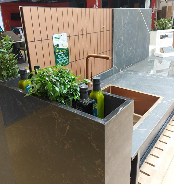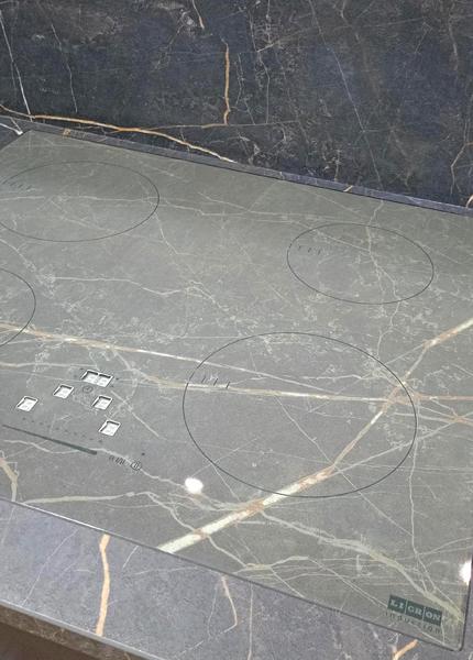 - Индукционная варочная панель LIGRON INDUCTION в том же декоре, что и столешница — Сардения. Модель LI FLAT60. Варочная панель врезана один уровень со столешницей.
