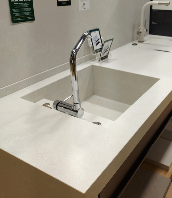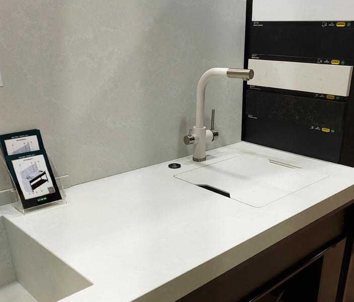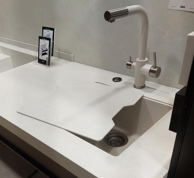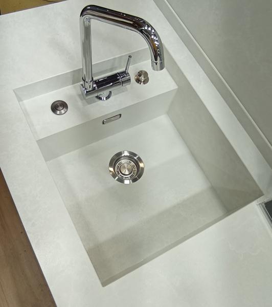 - Мойка №2 ЛИГСТОУН 400 в цвете жасмин. Мойка врезана под столешницу со смещением. Крышка из кварцевого камня закрывает полностью мойку и устанавливается заподлицо со столешнцей.